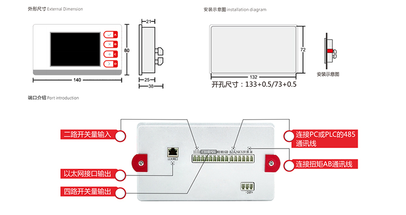 and one Ethernet port. RS485 implements MODBUS-RTU protocol,